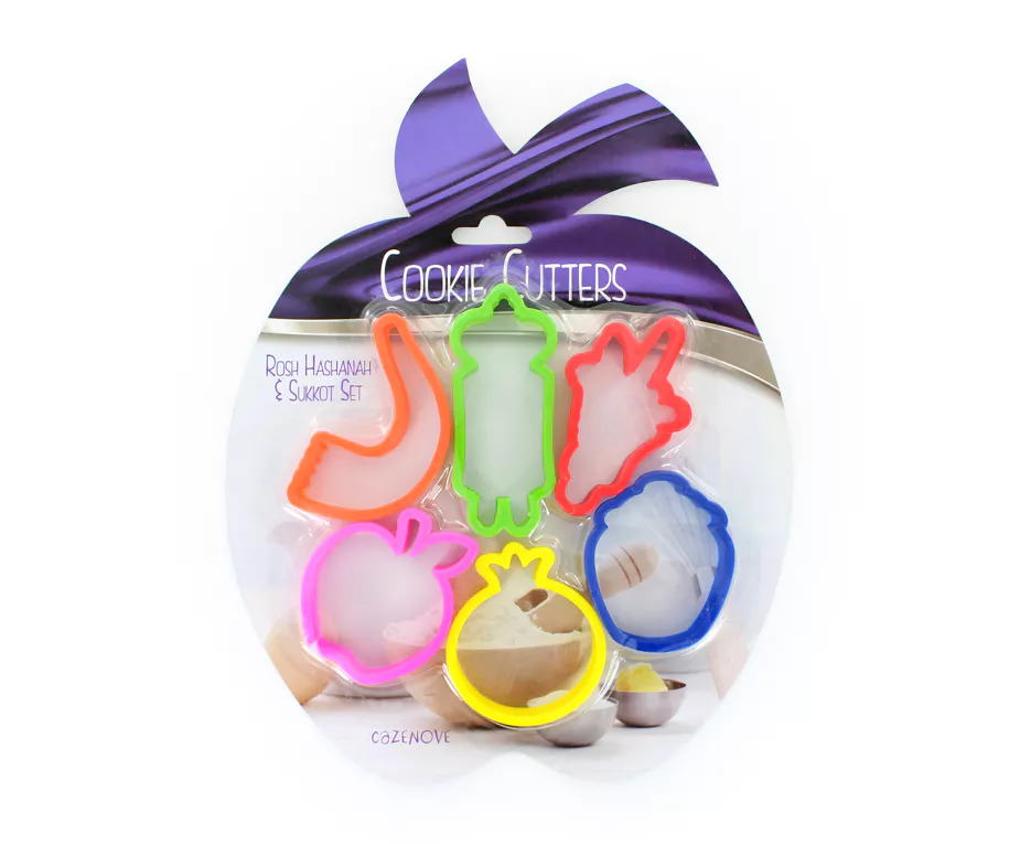 This set includes six plastic cookie cutters in traditional Jewish shapes, an apple, pomegranate, honey pot, shofar, Torah, and lulav & etrog. These shapes are closely associated with Rosh Hashanah traditions, while the lulav and etrog are also used for Sukkot, making this a useful item across more than one Jewish festival. Cookie cutters like these are often used in the run-up to the holidays to prepare themed biscuits and baked treats, especially when baking with family or children.